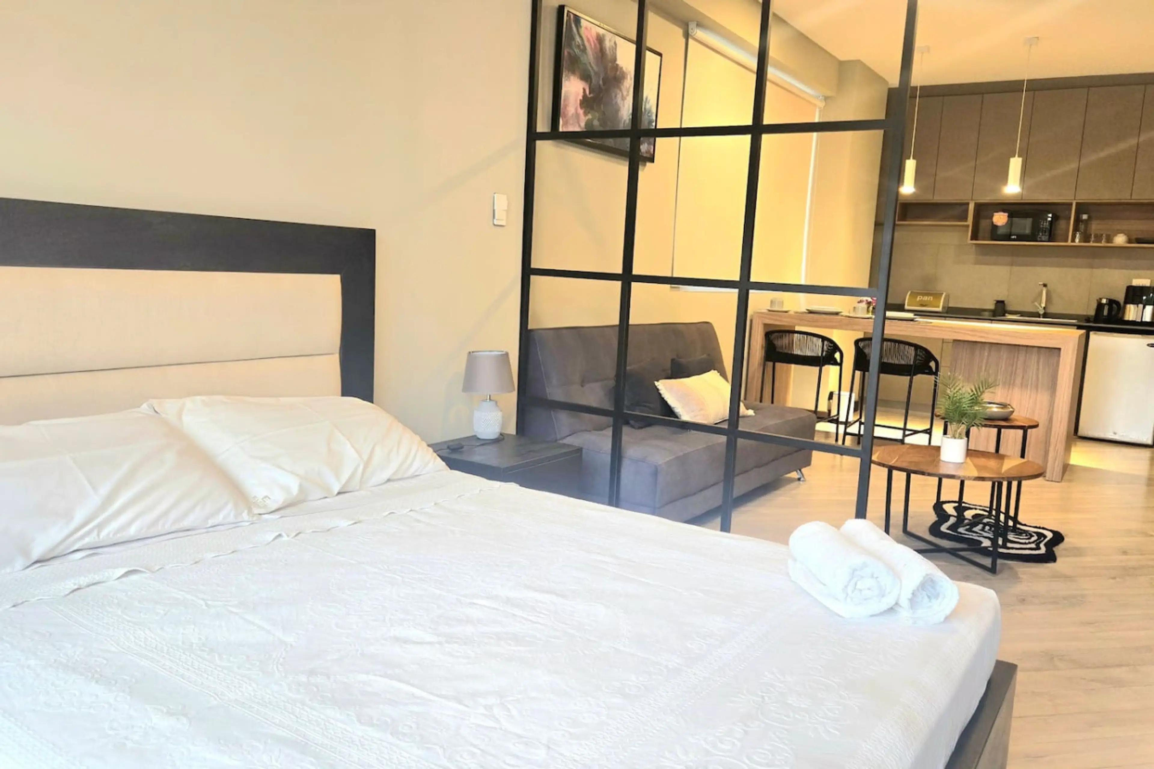 Hermoso monoambiente de lujo, con un hermoso balcón y vista a la ciudad, en la mejor zona de la ciudad, a pasos de Centros Comerciales, Supermercados, Restaurantes, Cines, Discotecas y Bares. Ideal para conocer la ciudad y sus principales atractivos o para viajes de trabajo. Tiene cocina, frigobar, ...